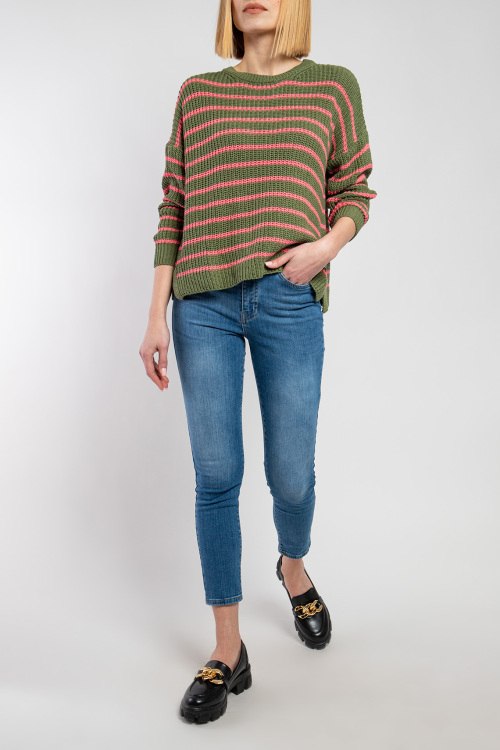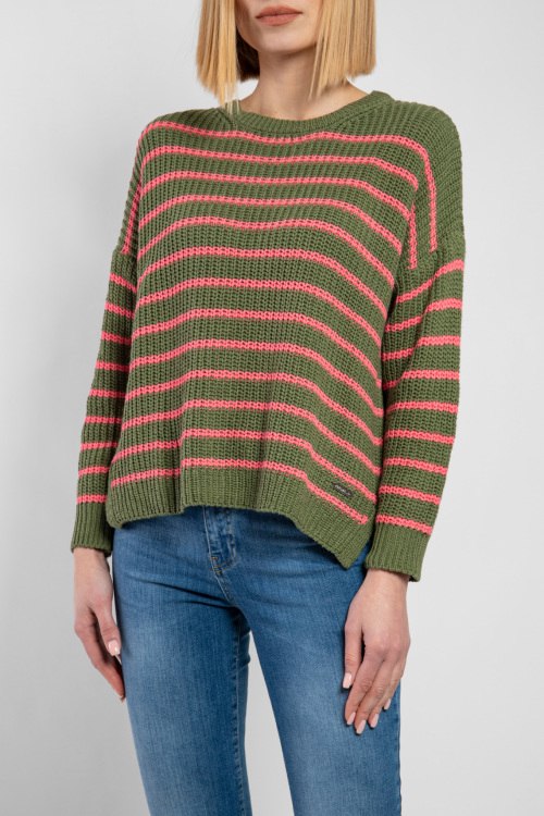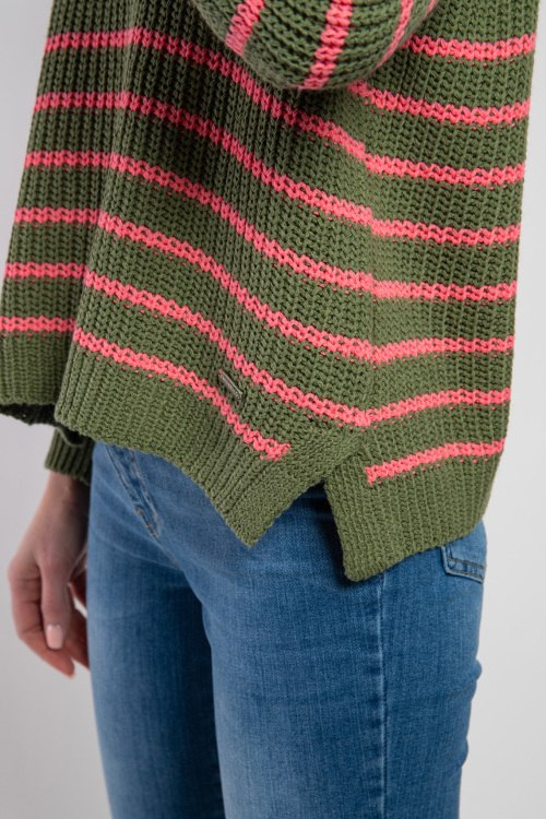Женский зеленый хлопковый джемпер от Fred Mello (Фред Мелло). Классическая вязка, розовая полоска, кргулый вырез горловины, разрезы по бокам, свободный фасон, классическая длина.