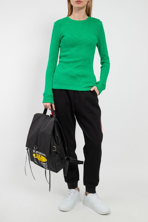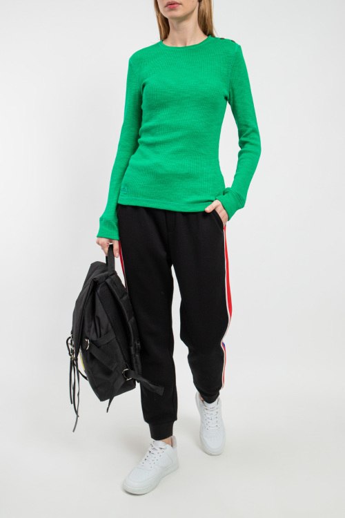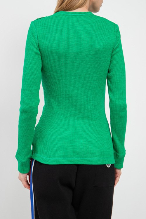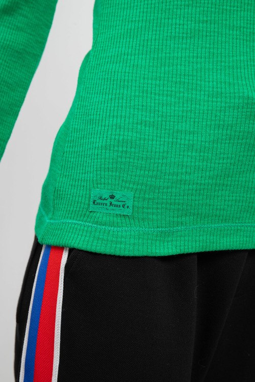 Женский зеленый хлопковый джемпер от Ralph Lauren (Ральф Лорен). Дизайн в рубчик, нашивка с логотипом, пуговицы на плече, круглый вырез горловины, классическая длина.