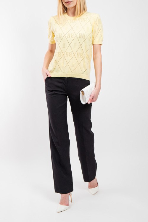 Женский желтый джемпер из хлопка от Barbara Alvisi (Барбара Алвиси). Классическая длина, круглый вырез горловины, короткие рукава, перфорация, трикотажная резинка на манжетах и по низу изделия, логотип бренда. Замеры для размера S/M: длина: 59 см, ширина по груди: 50 см, ширина по талии: 49 см, ширина по бедрам 43 см длина рукава по внутреннему шву: 8 см, ширина рукава: 18 см.