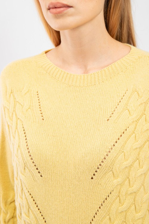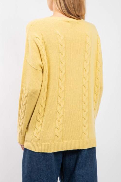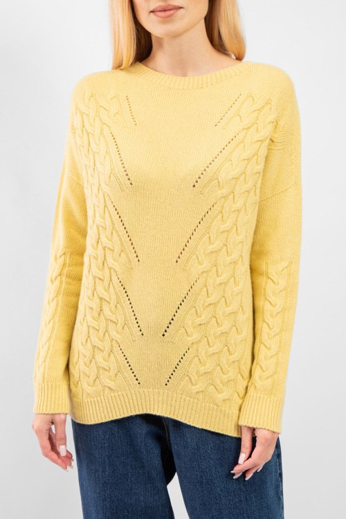 Детали: Женский желтый джемпер из шерсти и вискозы от Barbara Alvisi (Барбара Алвиси). Модель с примесью кашемира, узор косичкой, круглый вырез горловины, удлиненная длина, манжеты и нижний край в рубчик. Размер вещи на фото: S-M. Замеры: длина: 65 см, ширина груди 60 см, ширина по талии 55 см, ширина по бедрам: 52 см, длина по внутреннему шву рукава 46 см, ширина рукава 15 см