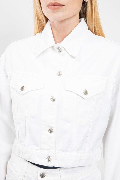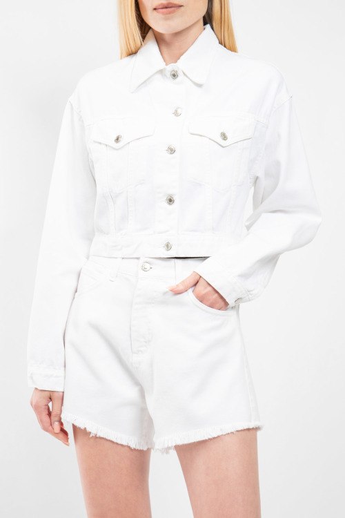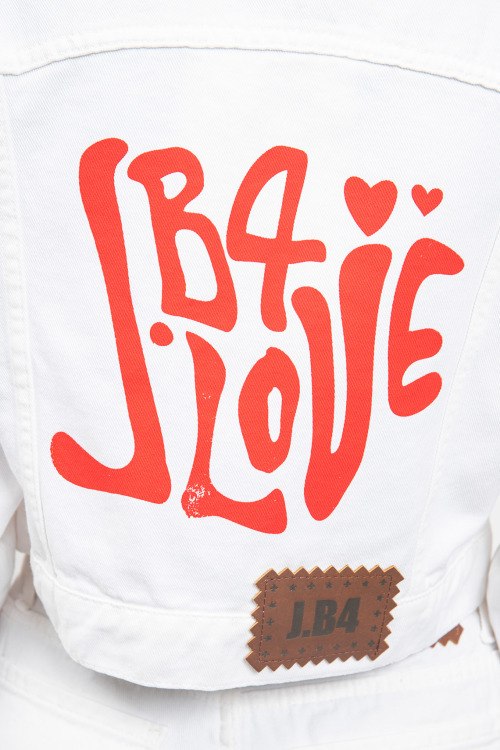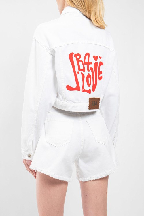 Женская белая джинсовая куртка от J.B4 Just Before (Джаст Бифо). Принт с логотипом на спине, отложной воротник, два кармана на груди с клапаном, застежка на пуговицы, нашивка с логотипом сзади на поясе, укороченная длина.