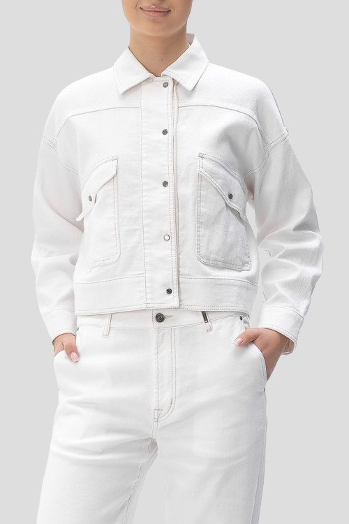 Детали: Женская белая джинсовая куртка из хлопка и льна от Tonet (Тонет). Классический воротник, застежка на пуговицы, длинные рукава, карманы с клапаном, манжеты на пуговице