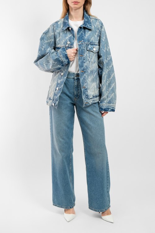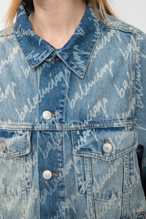 Женская голубая джинсовая куртка от Balenciaga (Баленсиага). Логотип по всей поверхности, дизайн с потертостями, отложной воротник, два кармана на груди, два боковых кармана, застежка на пуговицы, манжеты на пуговицах, нашивка с логотипом сзади на поясе, фасон оversize.
