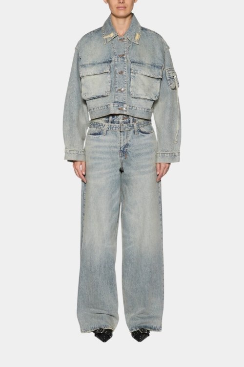 Детали: Женская голубая джинсовая куртка Campbell от Ksubi (Ксуби). Дизайн с потертостями, отложной воротник, два накладных кармана на груди, карман на рукаве, застежка на пуговицы, манжеты на пуговицах, укороченная длина
