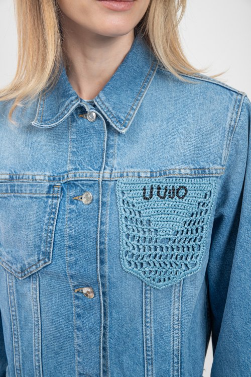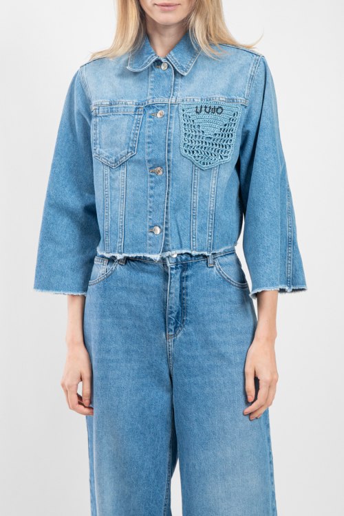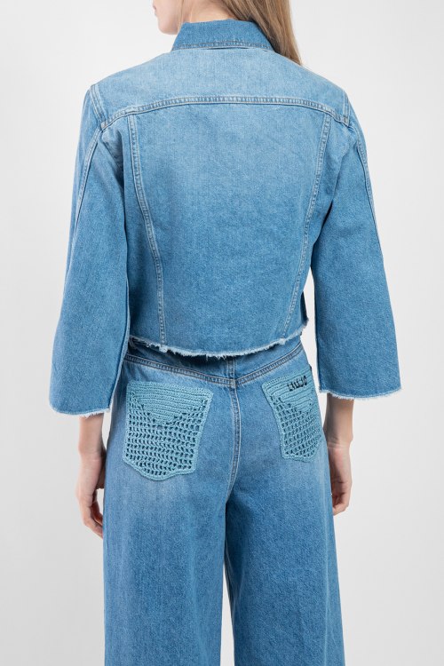 Детали: Женская голубая джинсовая куртка от Liu Jo (Лиу Джо). Отложной воротник, вязаный карман с логотипом на груди, застежка на пуговицы, укороченный рукав с необработанным краем, укороченная длина с необработанным краем
