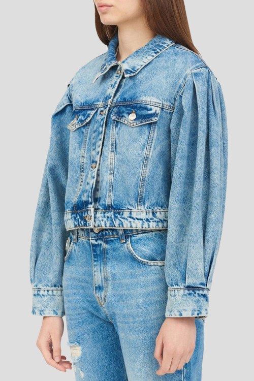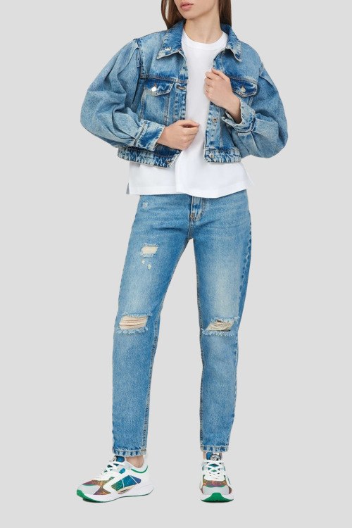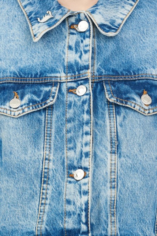 Детали: Женская синяя джинсовая куртка из хлопка от J.B4 Just Before (Джаст Бифо). Классический воротник, застежка на металлические пуговицы, нагрудные карманы с клапаном, укороченная длина, патч-лого
