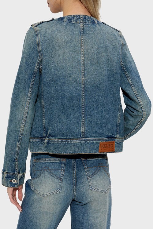 Женская синяя джинсовая куртка от Kenzo (Кензо). Модель без воротника, дизайн с потертостями, круглый вырез горловины, два кармана на груди, застежка на пуговицы, нашивка с логотипом сзади на поясе, классическая длина