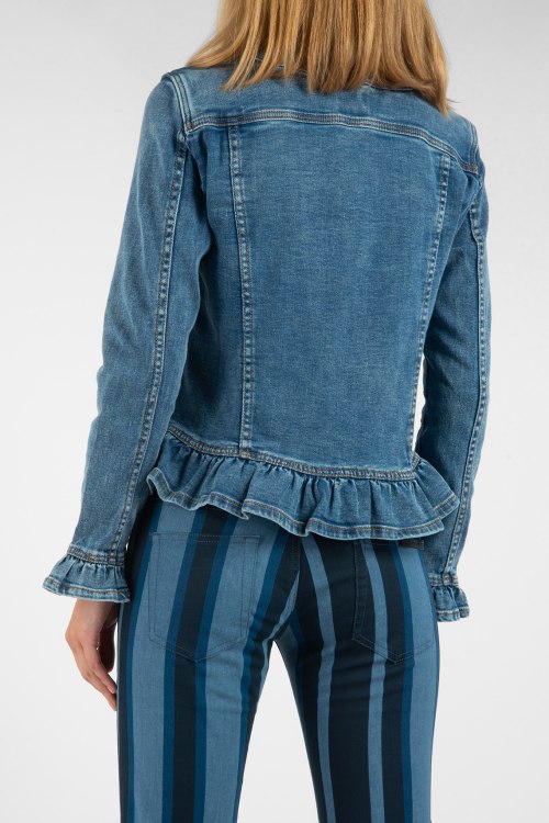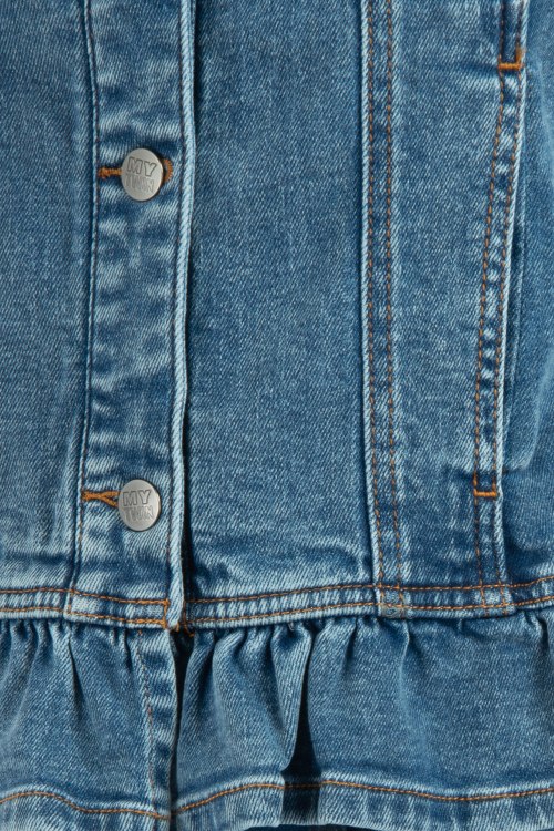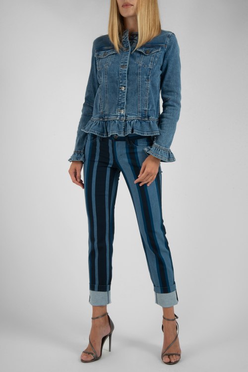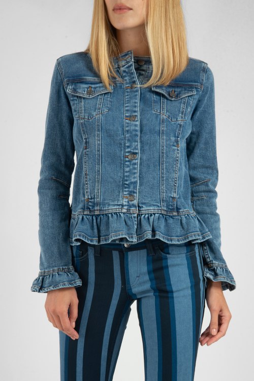 Женская синяя джинсовая куртка от TWINSET (Твинсет). Модель без воротника с круглой горловиной, два кармана на груди, два боковых кармана, рюши по низу и на манжетах, застегивается на пуговицы с логотипом