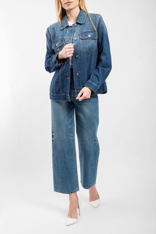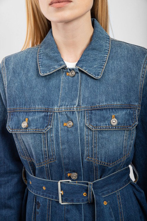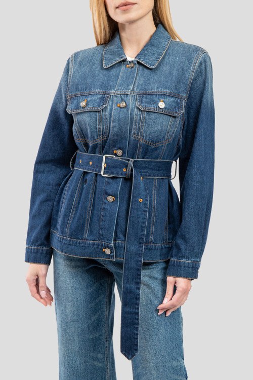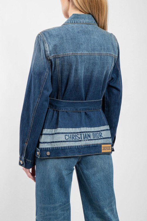 Детали: Женская темно-синяя джинсовая куртка от Christian Dior (Кристиан Диор). Дизайн с потертостями, отложной воротник, вышитый логотип сзади, четыре кармана, в талии с поясом, застежка на пуговицы, манжеты на пуговицах, удлиненная длина
