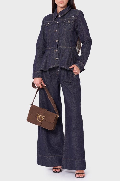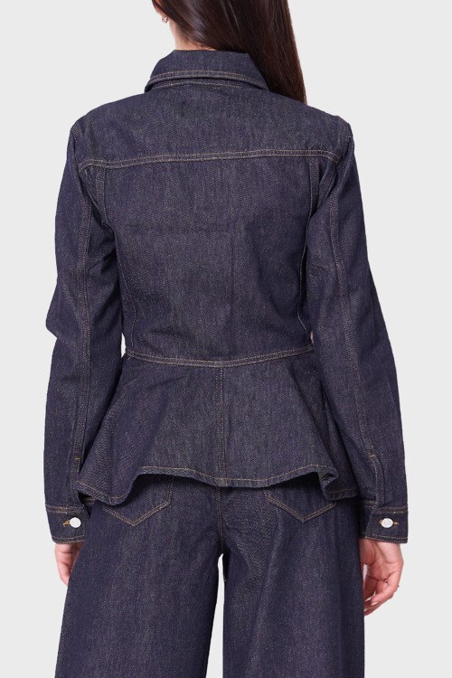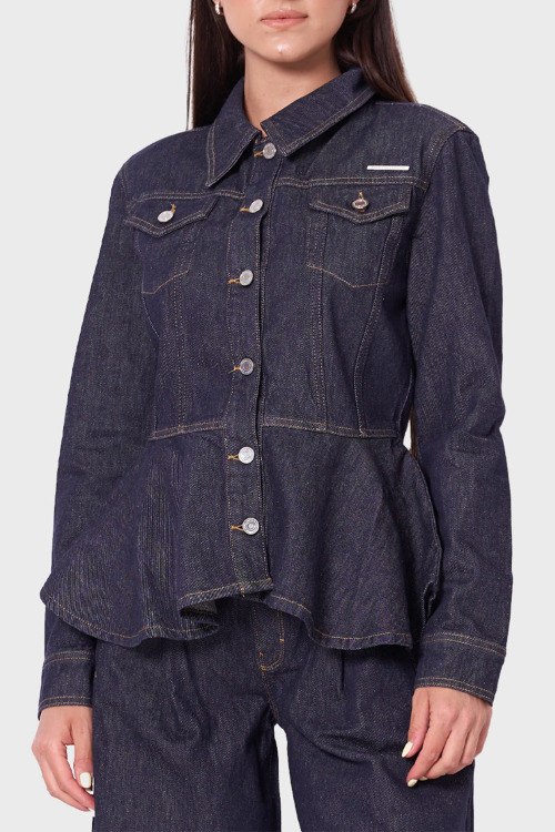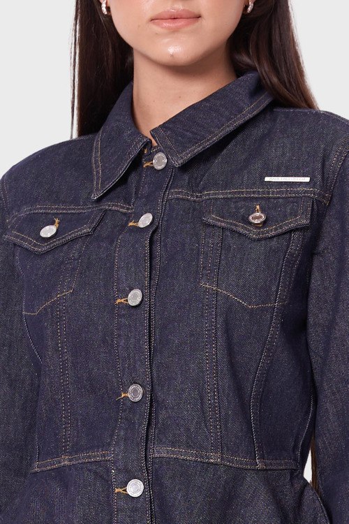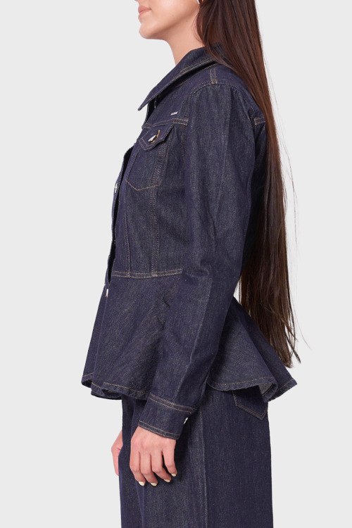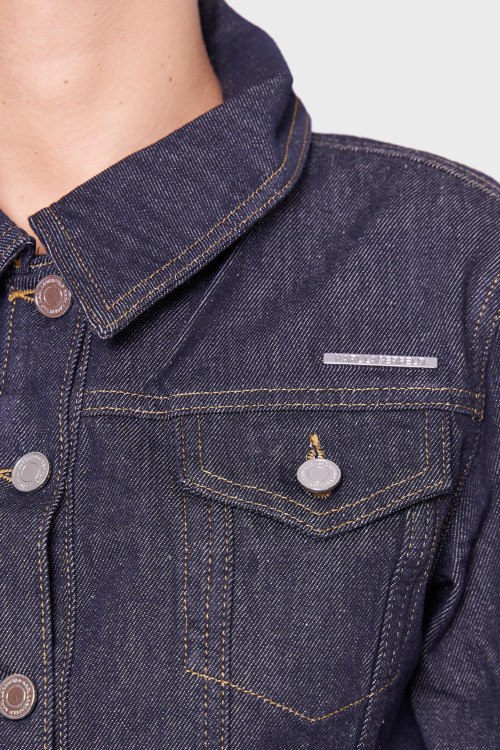 Детали: Женская темно-синяя джинсовая куртка Fashion от Karl Lagerfeld (Карл Лагерфельд). Отложной воротник, два кармана на груди, застежка на пуговицы, расклешенный фасон, классическая длина