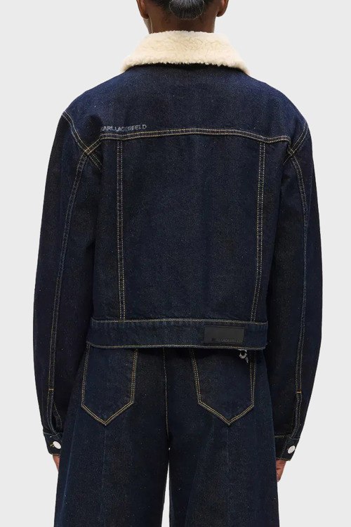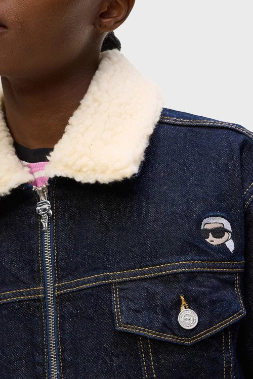 Детали: Женская темно-синяя джинсовая куртка Ikon от Karl Lagerfeld (Карл Лагерфельд). Отложной меховой воротник, логотип на груди, четыре кармана, застежка-молния, классическая длина