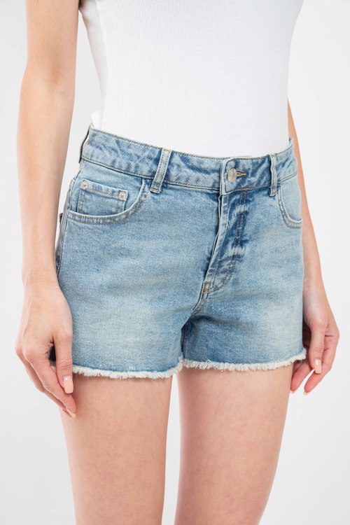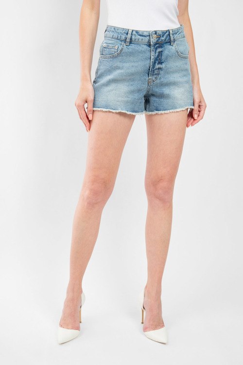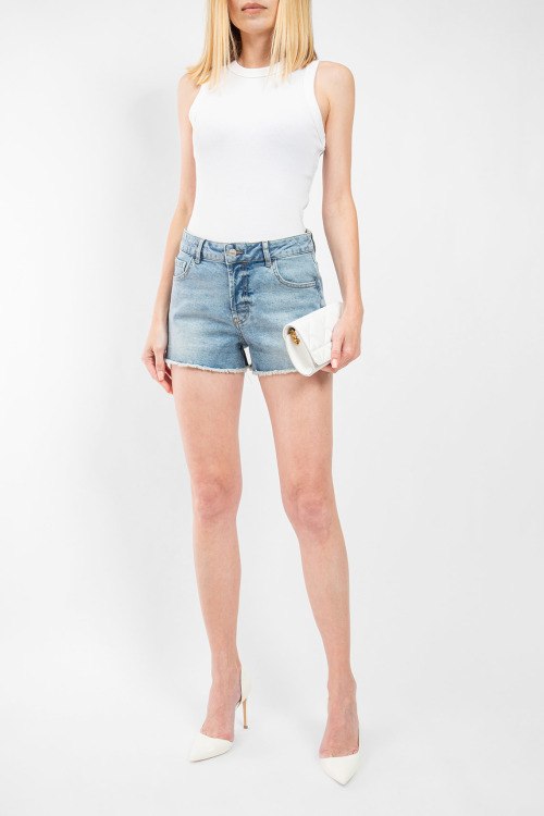 Женские голубые джинсовые шорты от Ice Play (Айс Плей). Пяти-карманная модель, пояс с петлями для ремня, нашивка с логотипом сзади на поясе, необработанный нижний край, короткая длина.