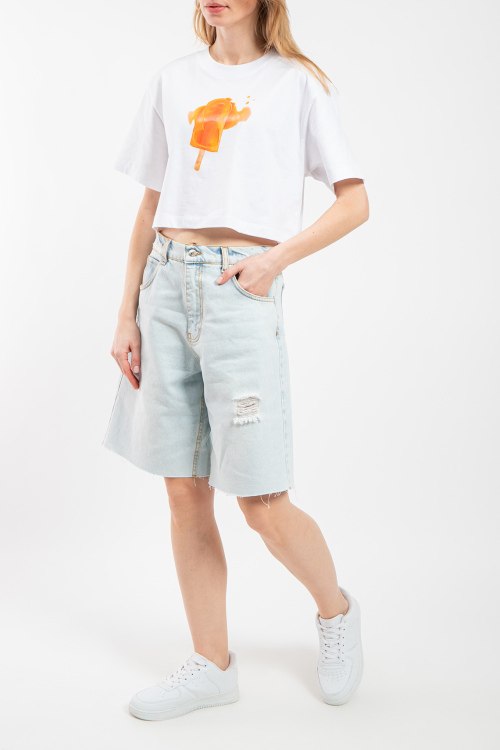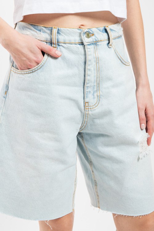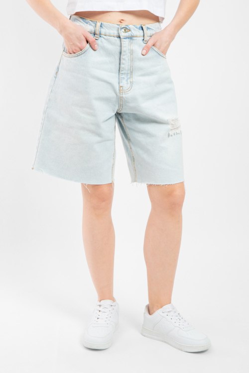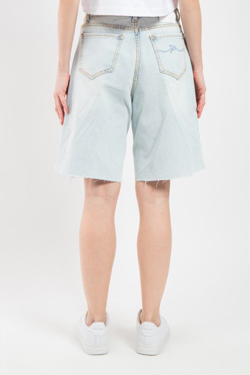 Детали: Женские голубые джинсовые шорты из хлопка от J.B4 Just Before (Джаст Бифо). Высокая посадка, застежка на молнию и пуговицу, пять карманов, петли в поясе для ремня, необработанные края, длина до колена, патч-лого, дизайн с потертостями