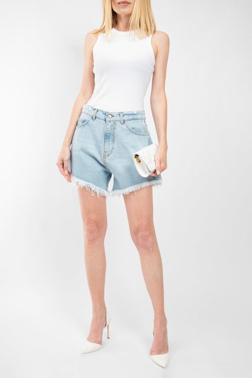 Женские голубые джинсовые шорты от J.B4 Just Before (Джаст Бифо). Пяти-карманная модель, пояс с петлями для ремня, нашивка с логотипом сзади на поясе, необработанный нижний край, короткая длина.