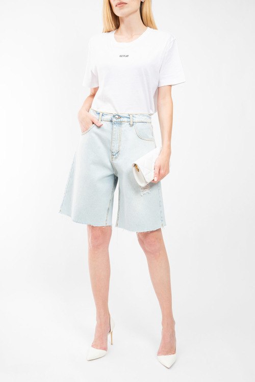 Женские голубые джинсовые шорты от J.B4 Just Before (Джаст Бифо). Пяти-карманная модель, дизайн с потертостями, пояс с петлями для ремня, нашивка с логотипом сзади на поясе, необработанный нижний край, длина до колен.