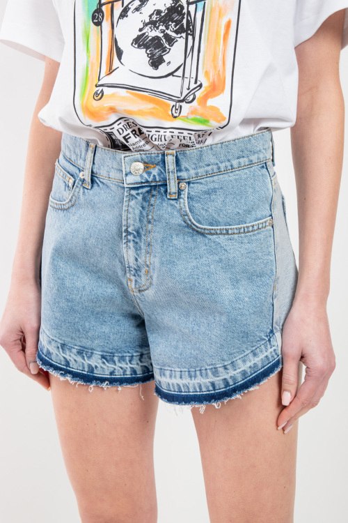 Женские голубые джинсовые шорты из хлопка от Moschino (Москино). Короткая длина, высокая посадка, застежка на молнию и пуговицу, комбинация цветов, пять карманов, петли в поясе для ремня, патч-лого, необработанные края.