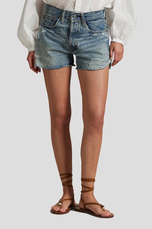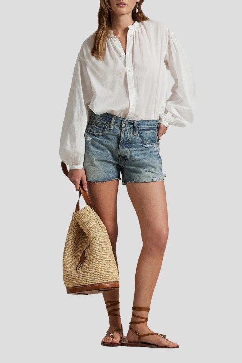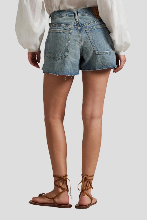 Детали: Женские голубые джинсовые шорты из хлопка от Polo Ralph Lauren (Поло Ральф Лорен). Короткая длина, высокая посадка, застежка на молнию и пуговицу, пять карманов, петли в поясе для ремня, дизайн с потертостями, рванные детали, необработанные края