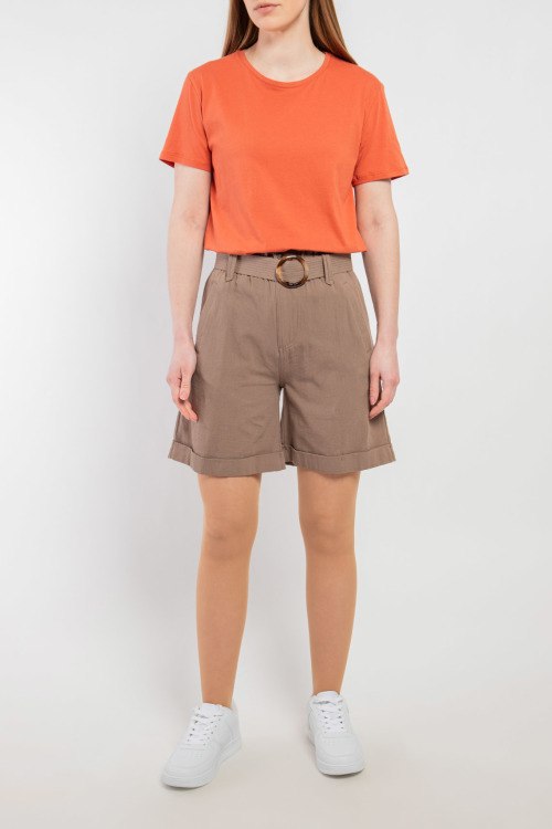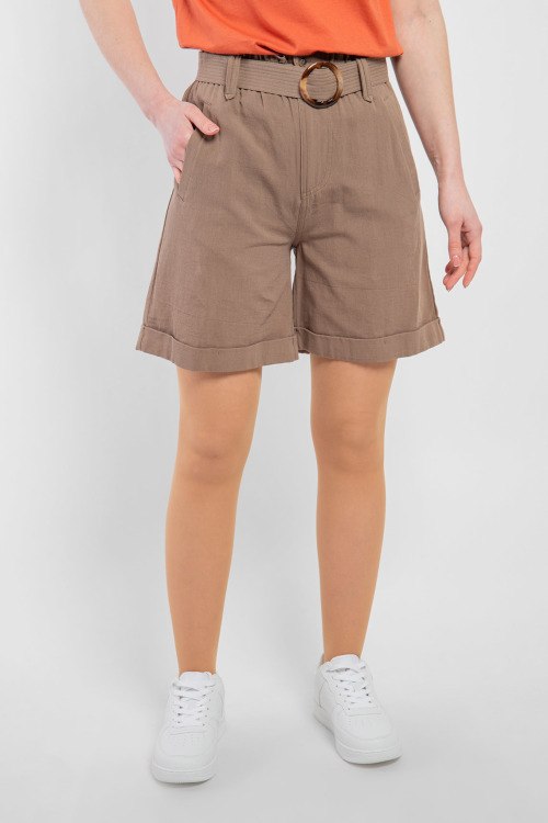 Женские коричневые джинсовые шорты от Yerse (Йерс). Завышенная посадка, в талии с поясом в тон изделия, боковые карманы, широкий крой, короткая длина.