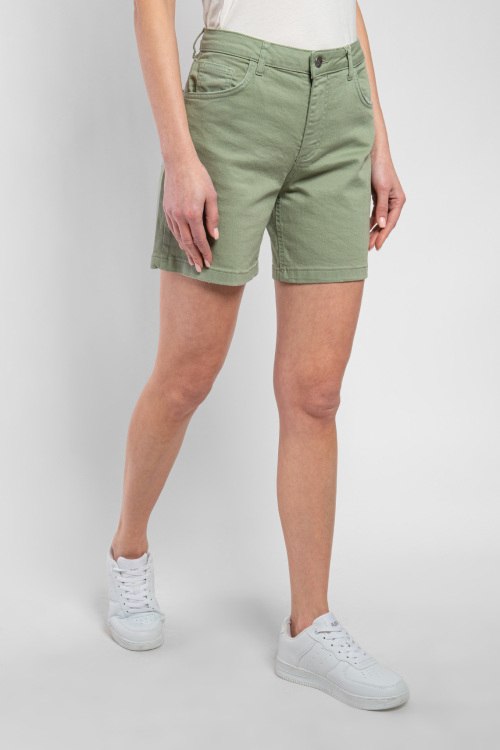 Женские оливковые джинсовые шорты от Fred Mello (Фред Мелло). Пяти-карманная модель, пояс с петлями для ремня, нашивка с логотипом сзади на поясе, застежка на молнию и пуговицу.