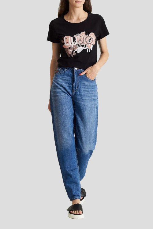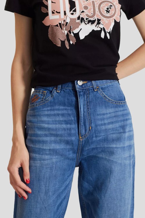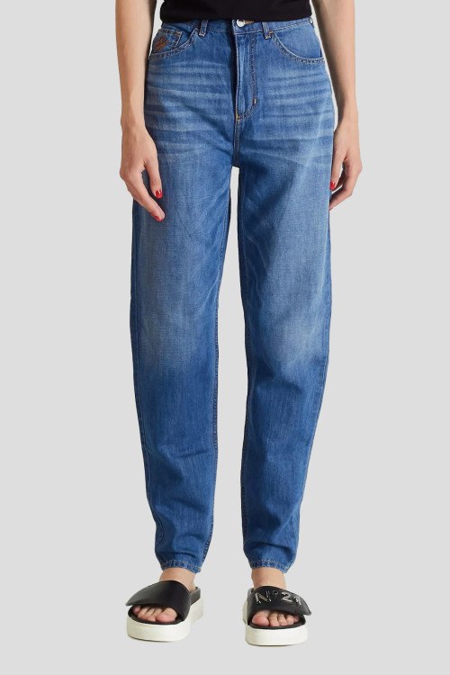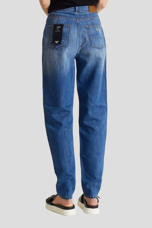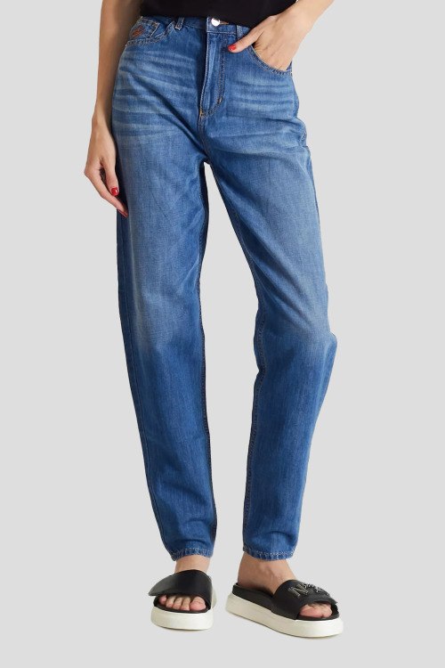Детали: Женские голубые джинсы из хлопка и льна от Armani (Армани). Пяти-карманная модель Mom, застежка на пуговицу и молнию, петли для ремня на поясе, патч-лого, эффект потертостей, металлический логотип сзади