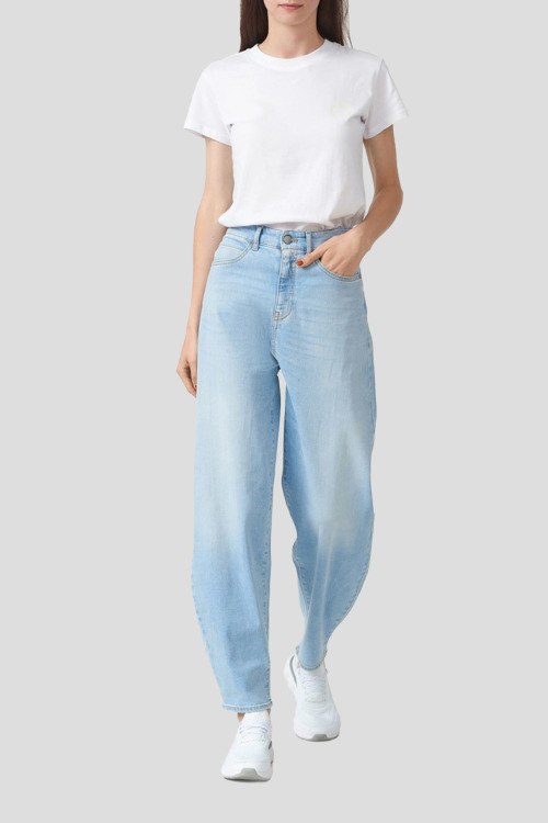 Детали: Женские голубые джинсы из хлопкового микса от Armani (Армани). Пяти-карманная модель Regular Fit, высокая посадка, застежка на пуговицу и молнию, петли для ремня на поясе, патч-лого, эффект потертостей, логотип сзади
