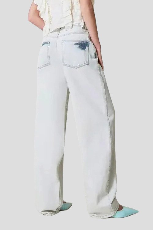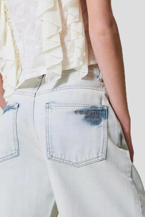 Детали: Женские голубые джинсы Мом от TWINSET (Твинсет). Пяти-карманная модель, пояс с петлями для ремня, вышитый логотип на заднем кармане, полная длина