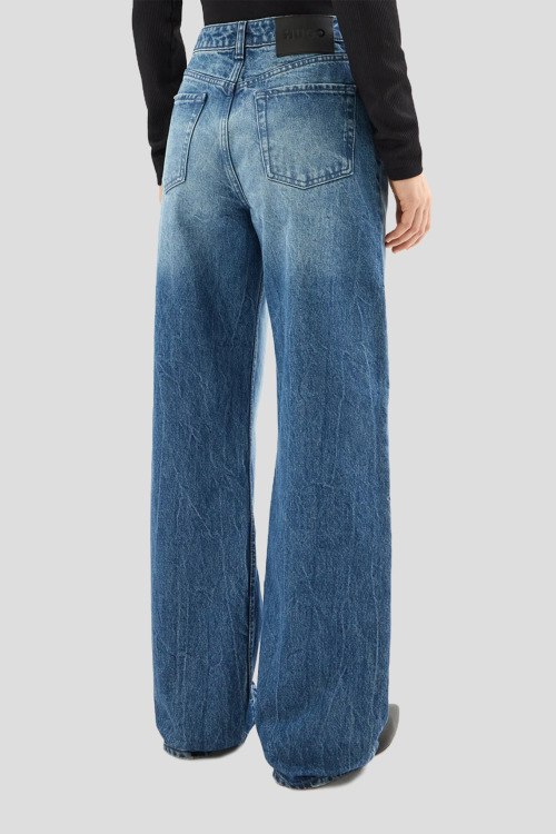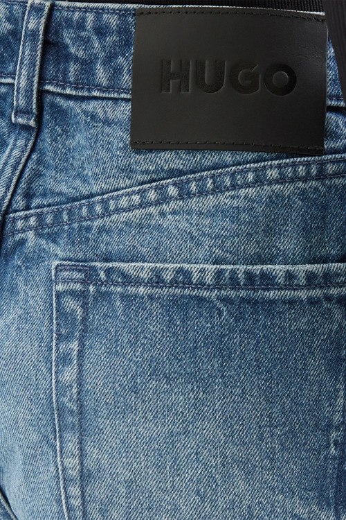Детали: Женские синие джинсы бойфренд от Hugo Boss (Хуго Босс). Пяти-карманная модель, пояс с петлями для ремня, дизайн с потертостями, нашивка с логотипом сзади на поясе, крой Regular Fit, полная длина