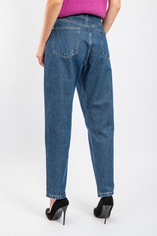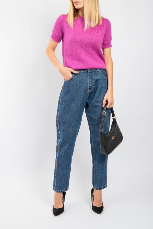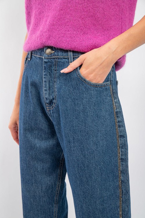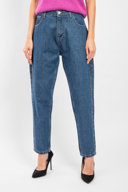 Женские синие джинсы Мом от Kontatto (Контатто). Пяти-карманная модель, пояс с петлями для ремня, лампасы из кристаллов, полная длина. Размер вещи на фото: XL. Замеры: длина: 103 см, ширина штанины вверху: 32,5 см, ширина по поясу: 43 см, ширина по бёдрам: 54 см, высота сидения: 39 см.