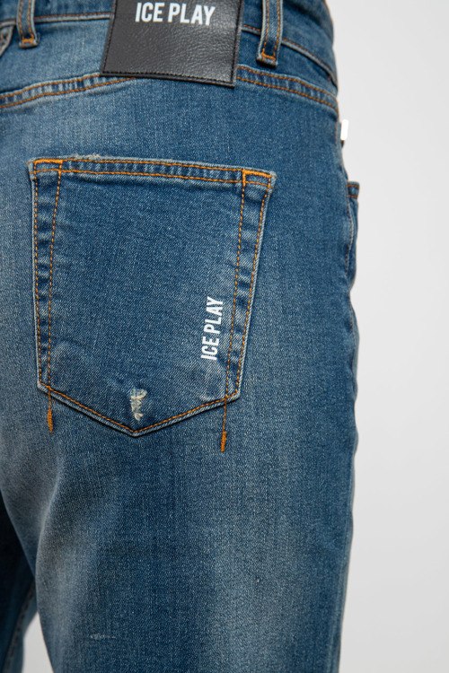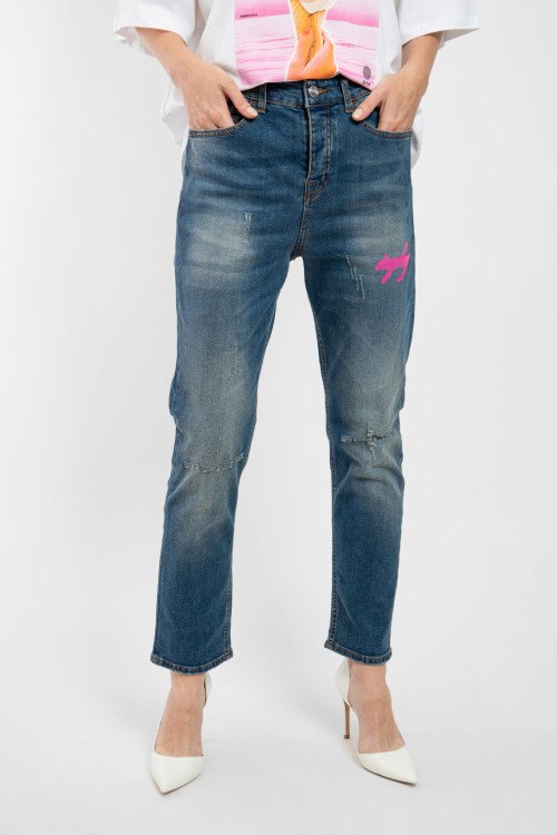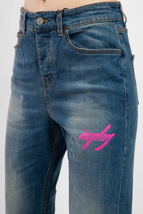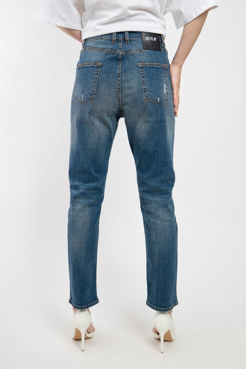 Женские темно-синие джинсы из хлопкового микса от Ice Play (Айс Плей). Высокая посадка, застежка на пуговицы, пять карманов, петли в поясе для ремня, дизайн с потертостями, принт с логотипом бренда, патч-лого.