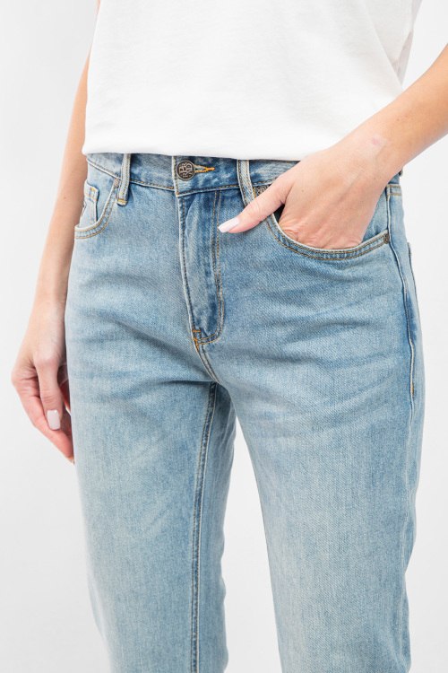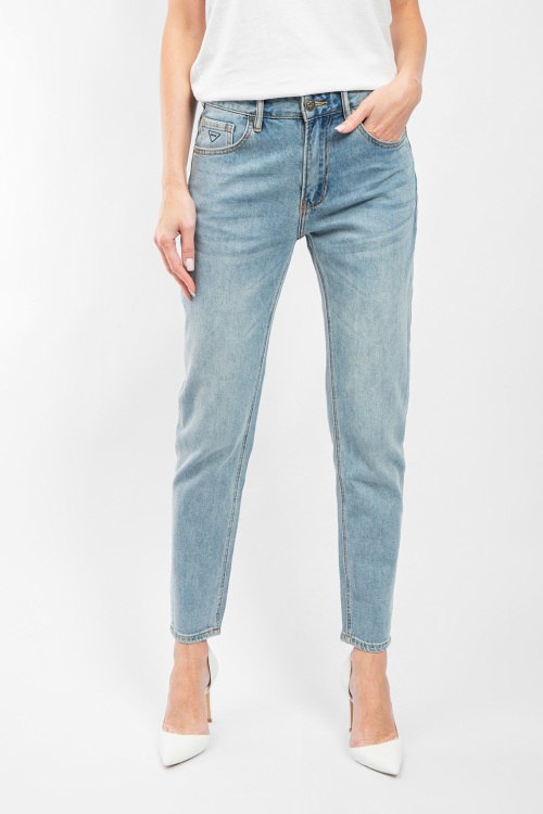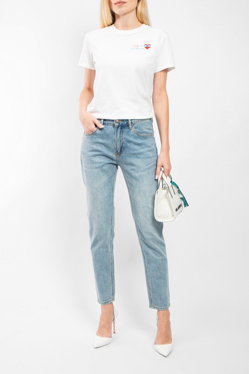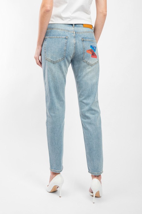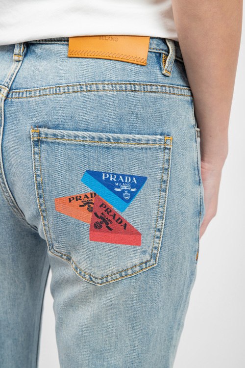 Детали: Женские голубые зауженные джинсы от Prada (Прада). Пяти-карманная модель, пояс с петлями для ремня, нашивка с логотипом сзади на поясе, принт с логотипом на заднем кармане, зауженный крой, длина до щиколотки
