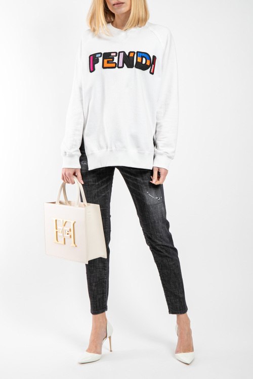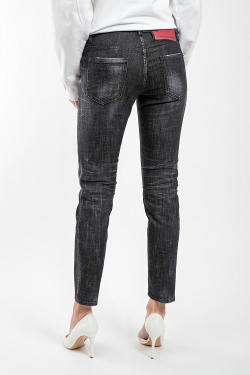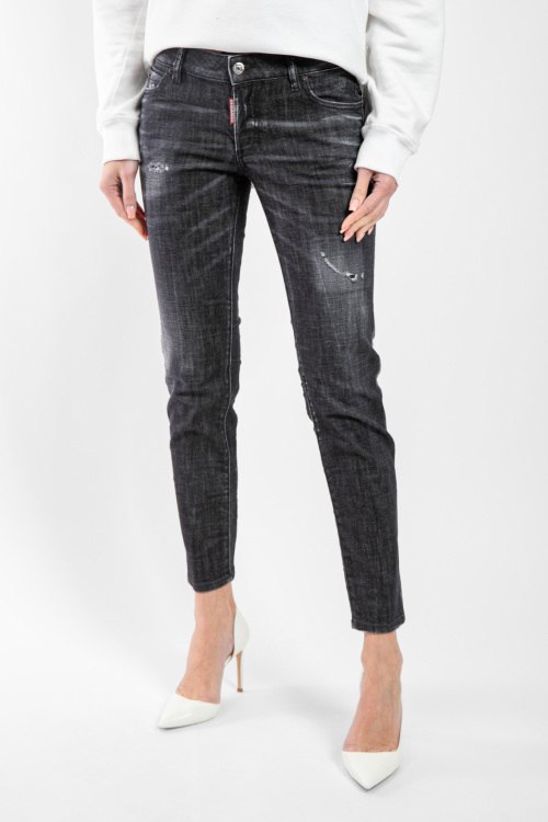 Женские серые джинсы Jennifer из хлопкового микса от Dsquared2 (Дискваред). Зауженная модель, застежка на молнию и пуговицу, средняя посадка, четыре кармана, петли в поясе для ремня, дизайн с потертостями, рванные детали.