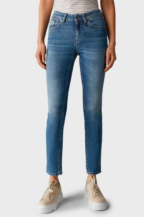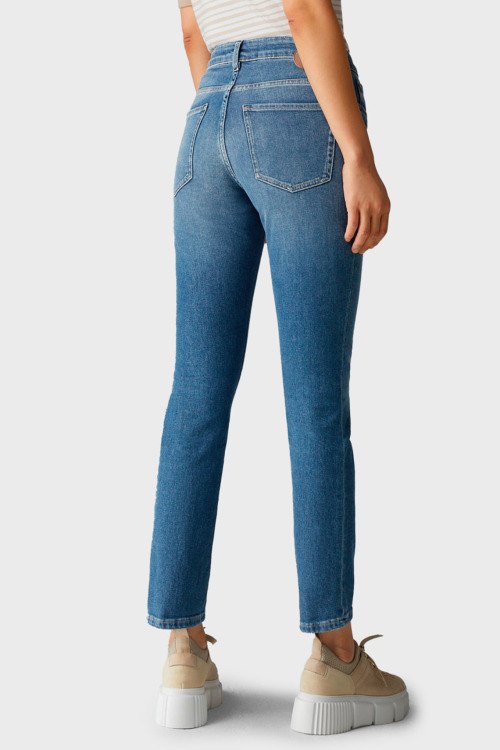 Женские синие джинсы Bridget girlfriend fit из хлопкового микса от Bogner (Богнер). Укороченная длина, средняя посадка, застежка на молнию и пуговицу, пять карманов, петли в поясе для ремня, патч-лого