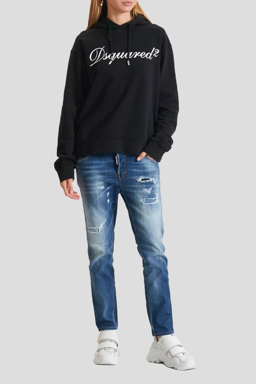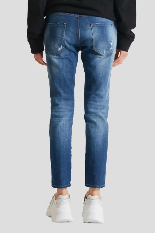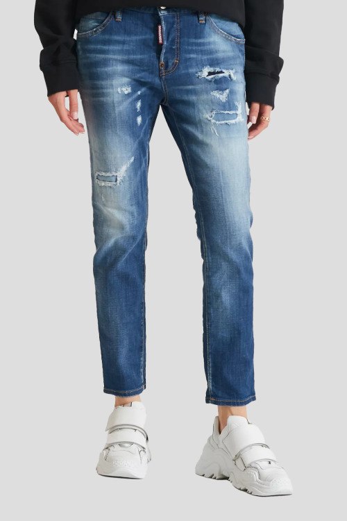 Детали: Женские синие джинсы из хлопка от Dsquared2 (Дискваред). Пяти-карманная зауженная модель, застежка на пуговицу и молнию, петли для ремня на поясе, эффект потертостей, прорехи, патч-лого