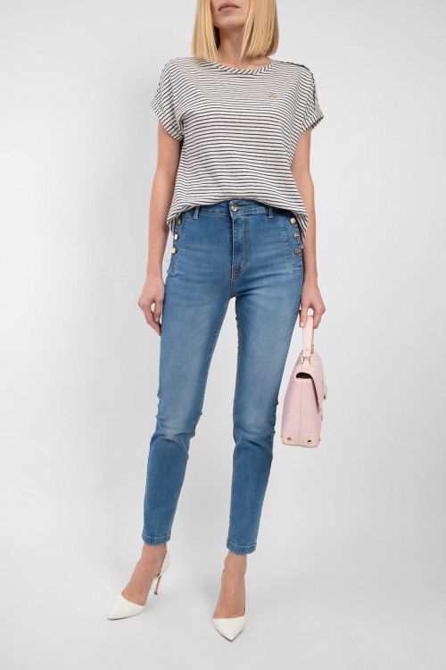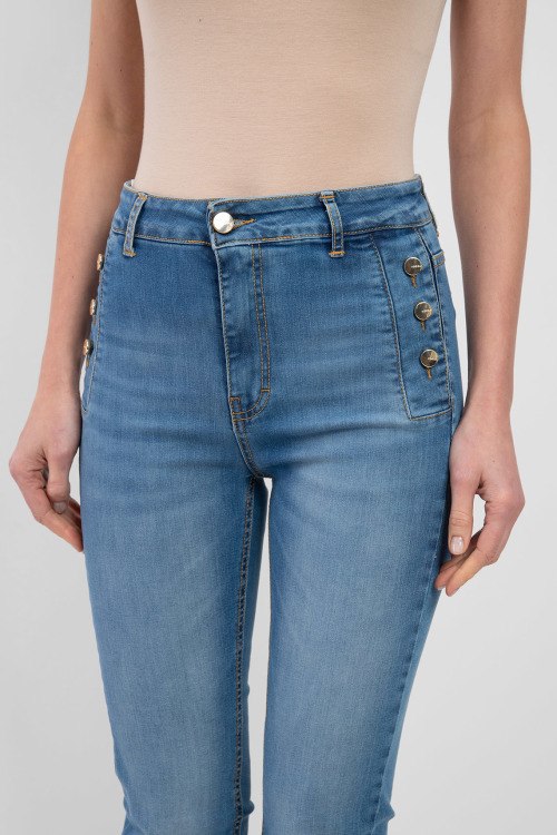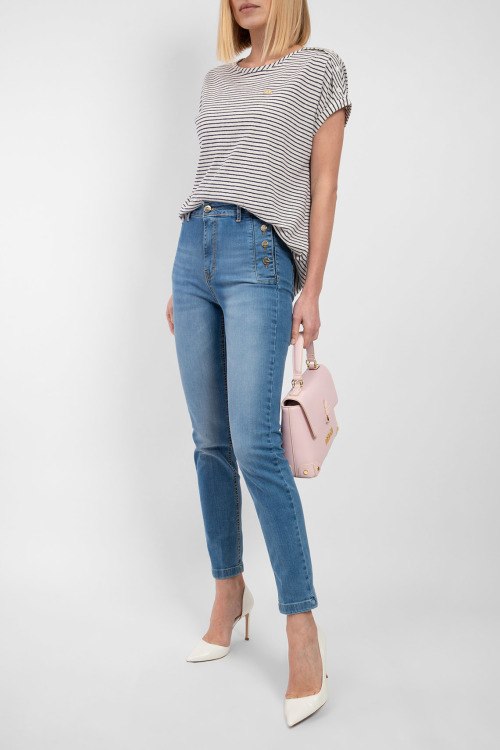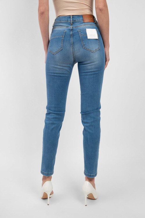 Женские синие джинсы из хлопкового микса от Kocca (Кокка). Зауженная модель, высокая посадка, застежка на молнию и пуговицу, четыре кармана, петли в поясе для ремня, патч-лого.