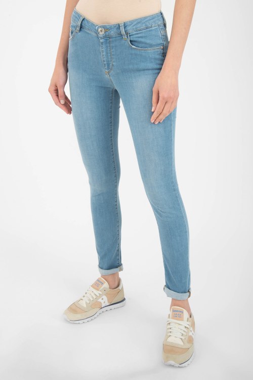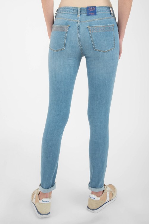 Джинсы голубого цвета из хлопкового микса. Однотонная модель, высокая посадка пояса, застегивается на пуговицу и застежку-молнию, пяти карманная модель, петли для ремня, аппликация из страз.