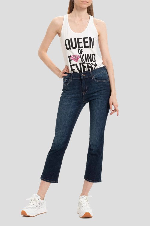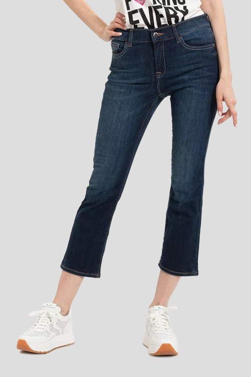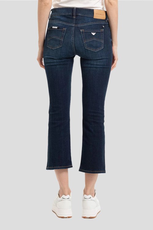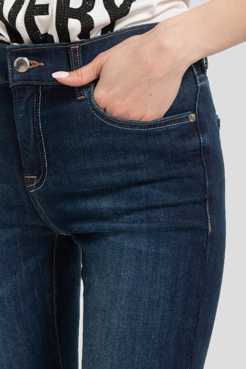 Детали: Женские темно-синие джинсы из хлопка от Armani (Армани). Укороченная, пяти-карманная модель, средняя посадка, петли для ремня на поясе, патч-лого, эффект потертостей