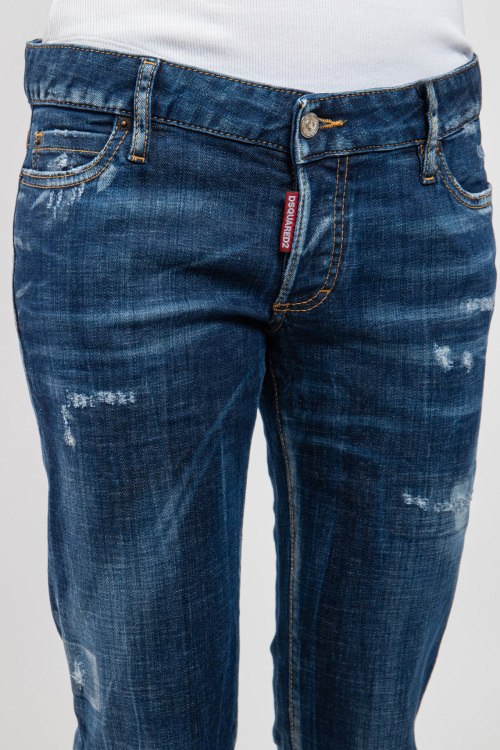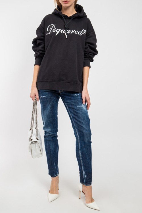 Женские темно-синие джинсы из хлопкового микса от Dsquared2 (Дискваред). Полная длина, застежка на пуговицы, рваные детали, петли в поясе для ремня, нашивка с логотипом бренда, пять карманов.