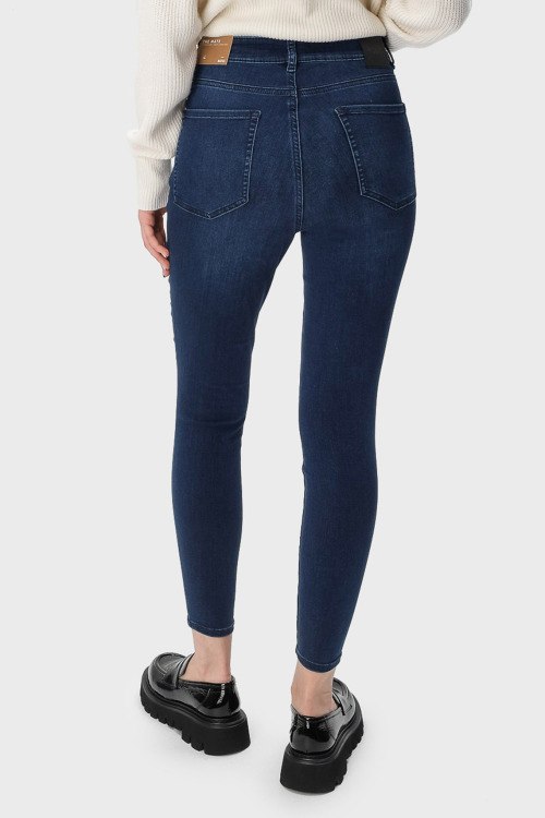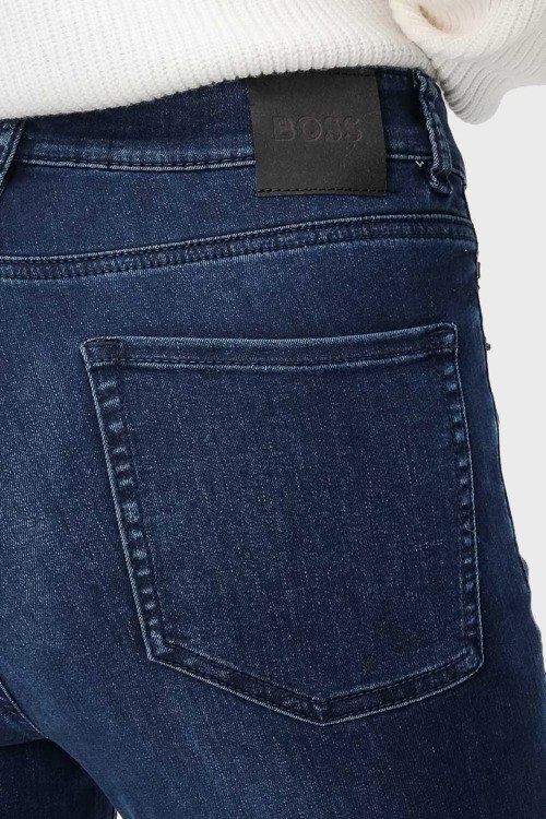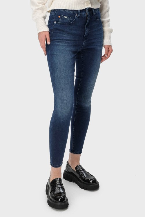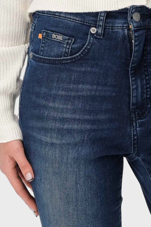 Женские темно-синие джинсы из хлопкового микса от Hugo Boss (Хуго Босс). Зауженная, укороченная модель, пять карманов, средняя посадка, шлевки для ремня на поясе, патч-лого, дизайн с эффектом потертости