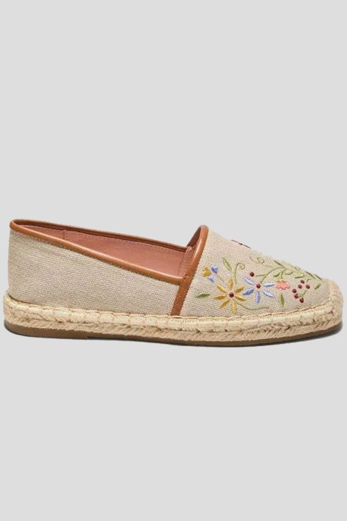 Детали: Женские песочные эспадрильи из кожи и текстиля от Coccinelle (Кочинелле). Цветочная вышивка, закругленный носок, кожаная стелька, плетеная подошва из рафии