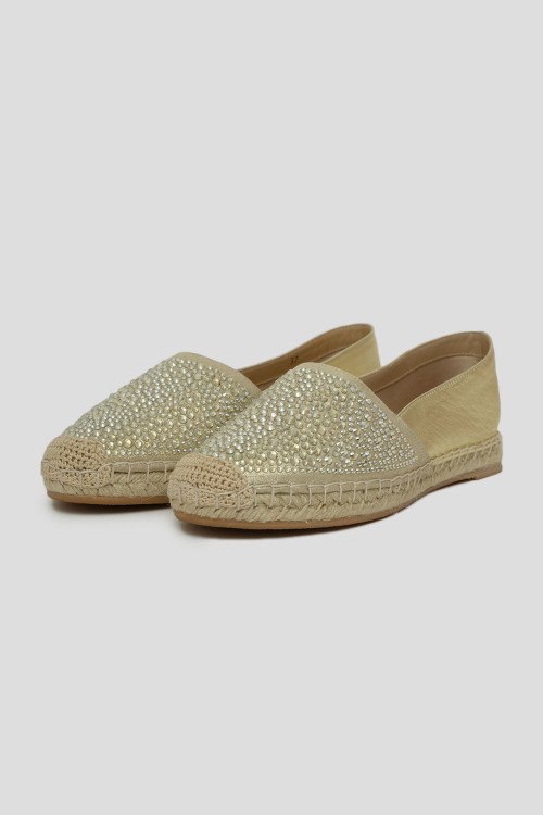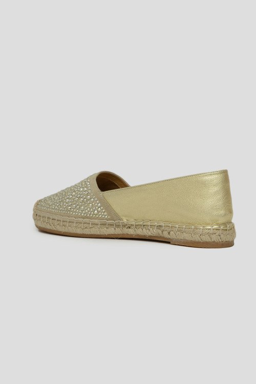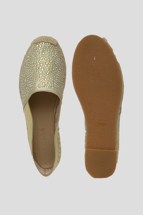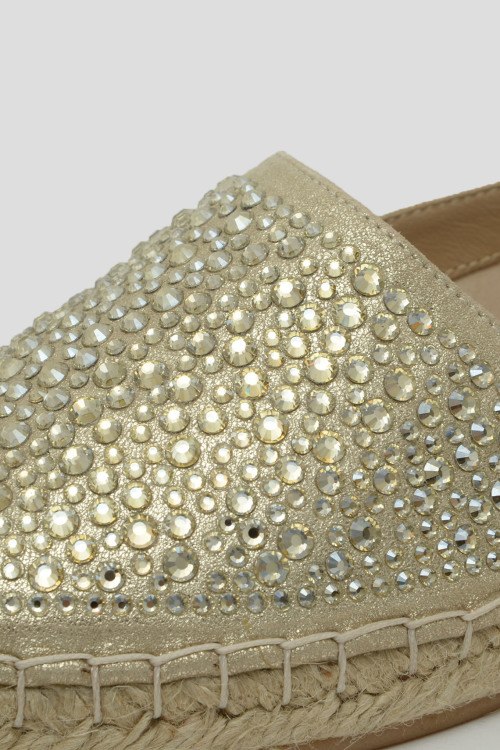Детали: Эспадрильи золотого цвета из натуральной кожи. Закругленный носок, плоская подошва дополнена джутом. Декорированы спереди стразами