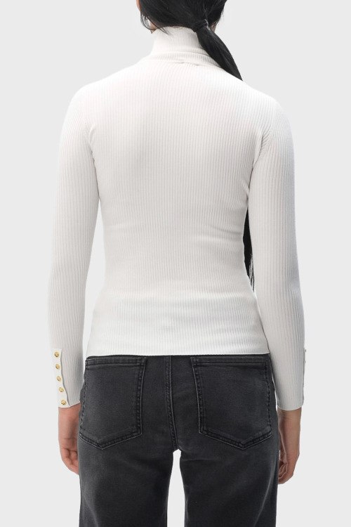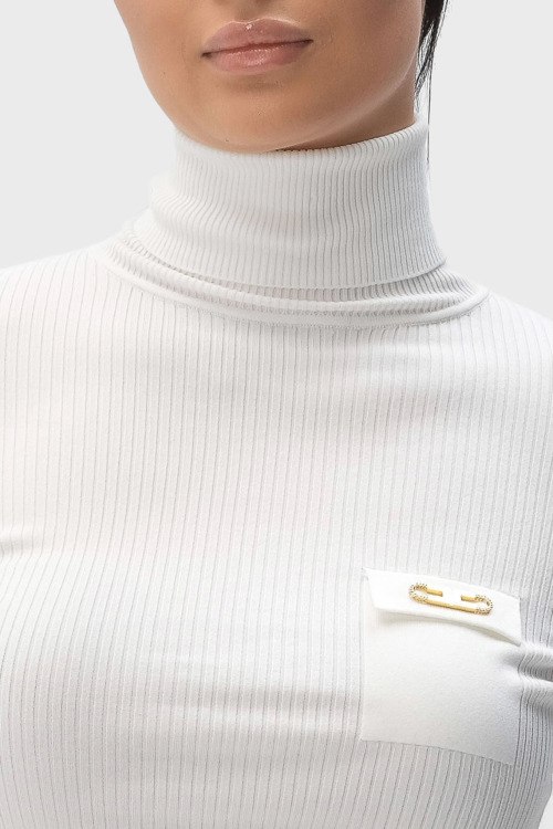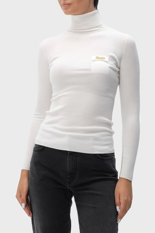 Детали: Женский белый гольф из лиоцелла от Elisabetta Franchi (Елизабетта Франчи). Модель с примесью шелка, дизайн в рубчик, высокая горловина, логотип на груди, облегющий фасон, классическая длина