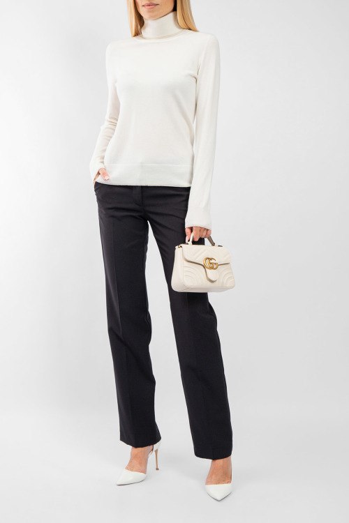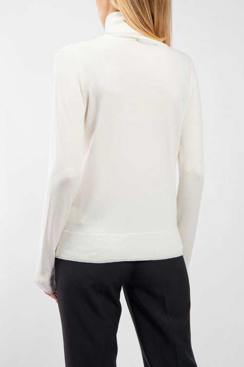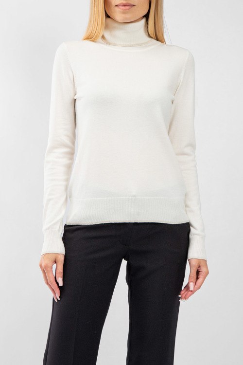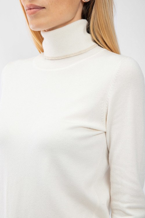 Женский белый трикотажный гольф от Kocca (Кокка). Высокая горловина с отделкой из люрекса, классическая длина, манжеты и нижний край в рубчик.