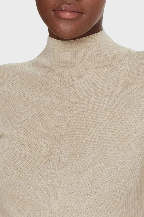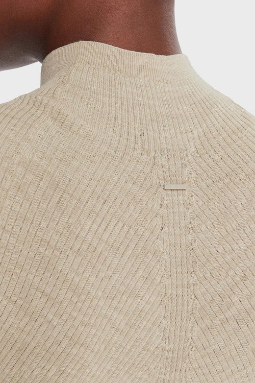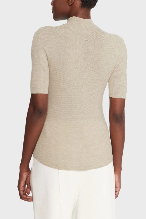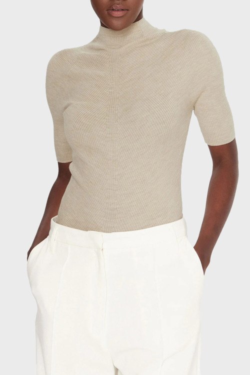 Детали: Женский бежевый гольф из шерсти от Hugo Boss (Хуго Босс). Воротник-стойка, короткие рукава, дизайн в рубчик, логотип бренда