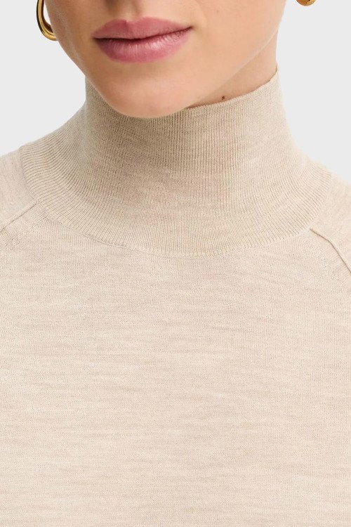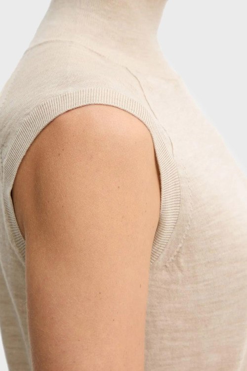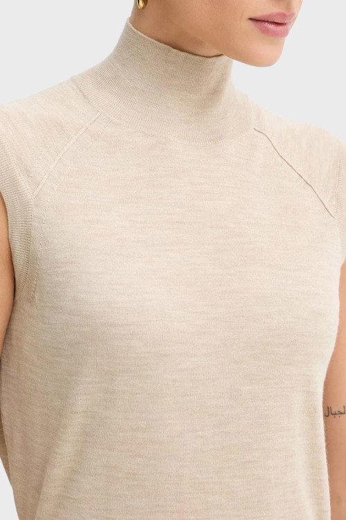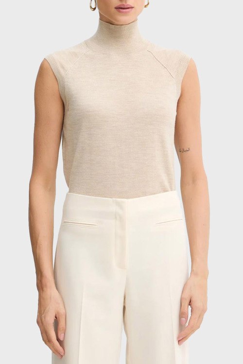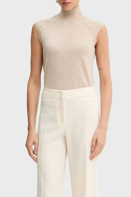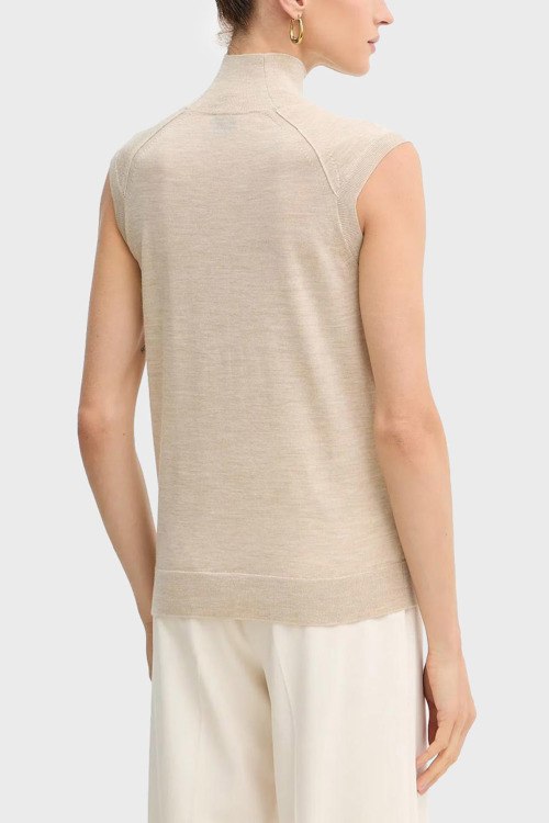 Детали: Женский бежевый гольф из шерсти от Hugo Boss (Хуго Босс). Высокий воротник, без рукавов, трикотажная резинка по низу изделия