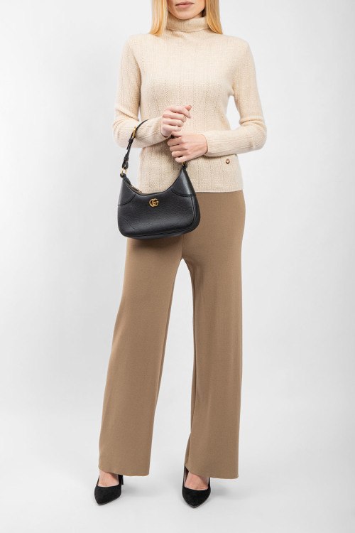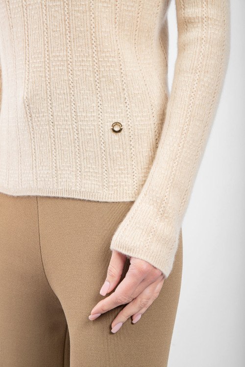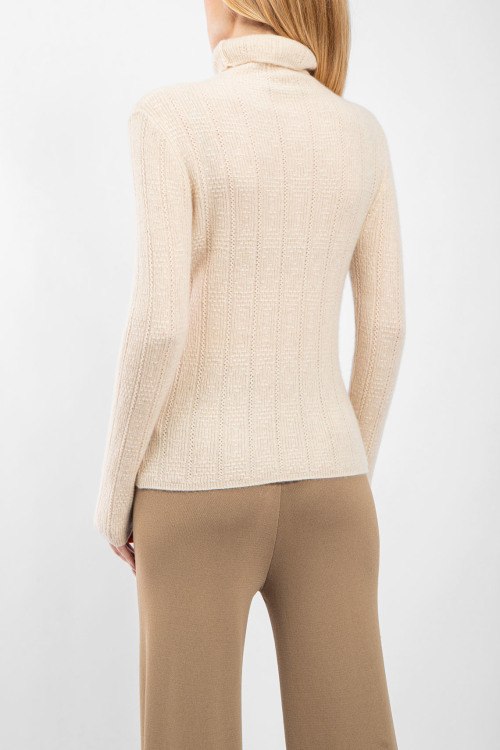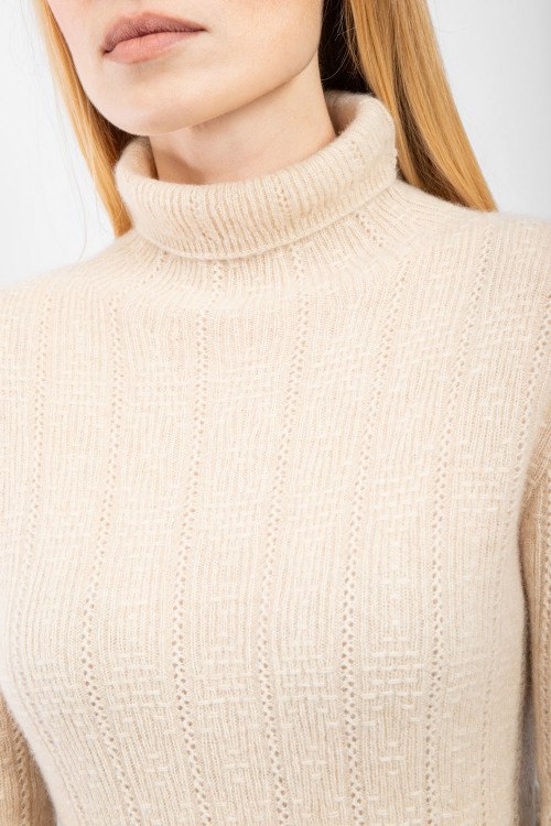 Детали: Женский бежевый кашемировый гольф от Loro Piana (Лоро Пьяна). Вязаный узор, высокая горловина, нашивка с логотипом, классическая длина