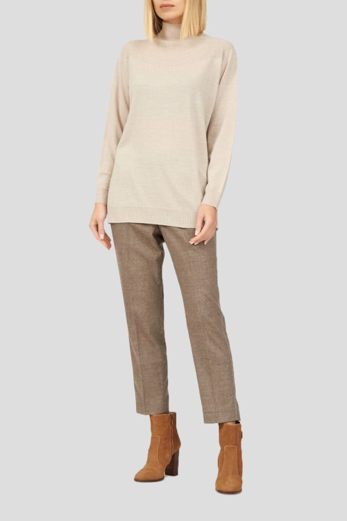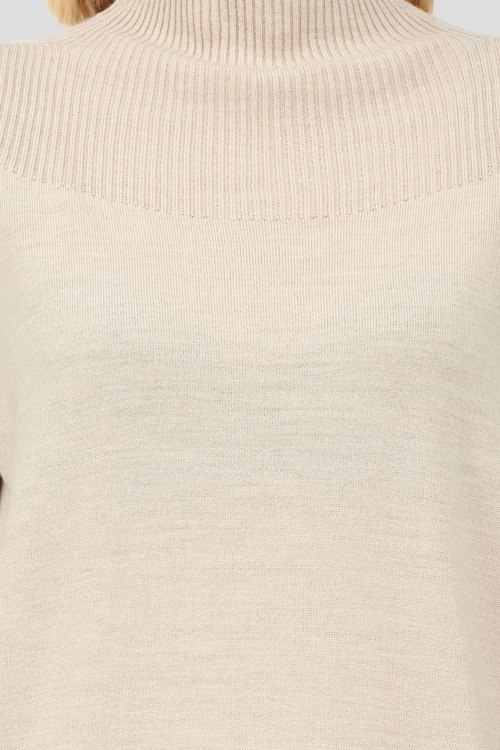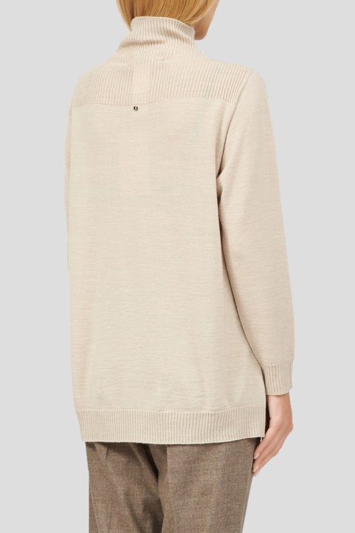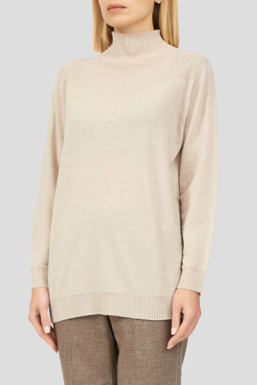Детали: Женский бежевый гольф из шерстяного микса от Marina Rinaldi (Марина Ринальди). Удлиненная модель, высокий воротник-стойка, длинные рукава, трикотажная резинка на манжетах и по низу изделия