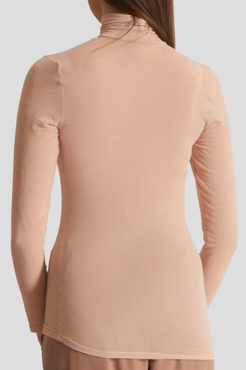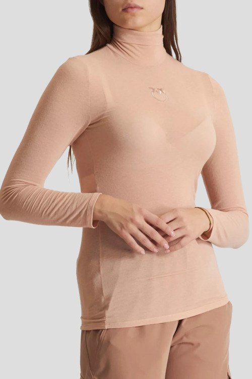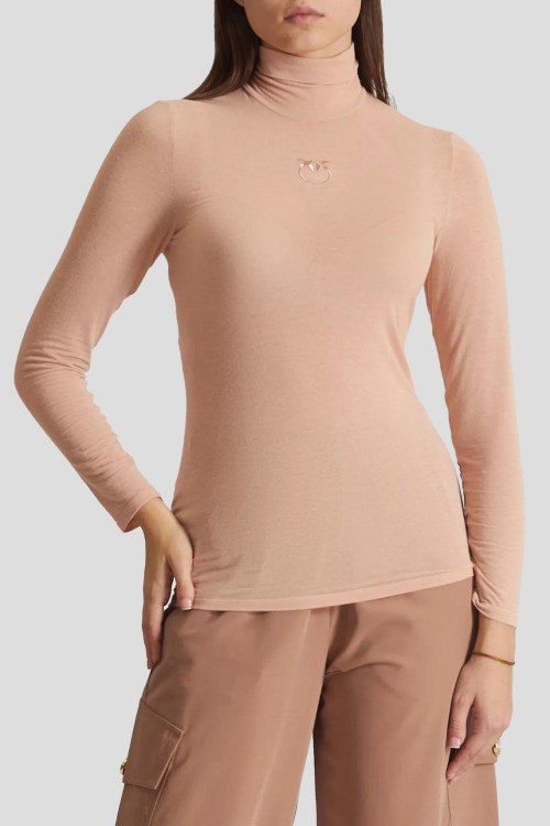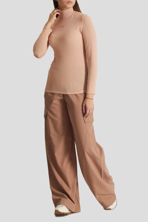 Детали: Женский бежевый гольф из вискозы и кашемира от Pinko (Пинко). Воротник-стойка, длинные рукава, вышитый логотип бренда