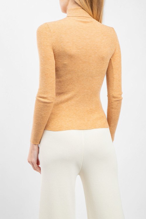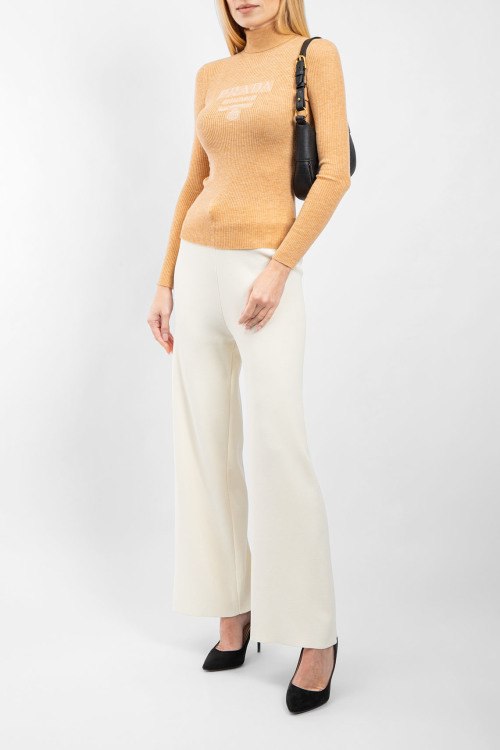 Женский бежевый шерстяной гольф от Prada (Прада). Модель с примесью шелка, дизайн в рубчик, вышитый логотип на груди, высокая горловина, облегающий фасон, классическая длина.