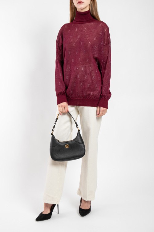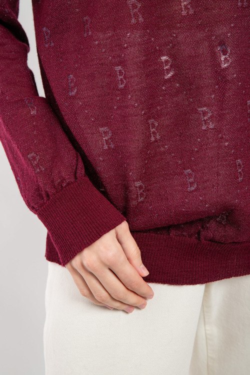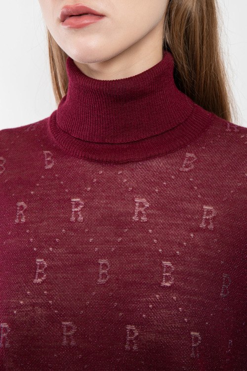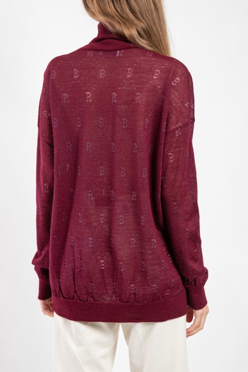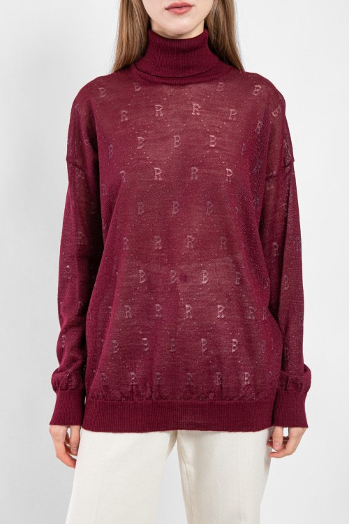 Женский бордовый гольф из шерстяного микса от Barbara Alvisi (Барбара Алвиси). Удлиненная модель, высокий воротник-стойка с отворотом, полупрозрачная модель, дизайн с монограммой, низ изделия и манжеты с трикотажной резинкой. Замеры для размера: S-M длина: 69 см, ширина по груди: 59 см, ширина по талии: 56 см, ширина по бёдрам: 52 см, длина рукава по внутреннему шву: 51,5 см, ширина рукава: 18 см.