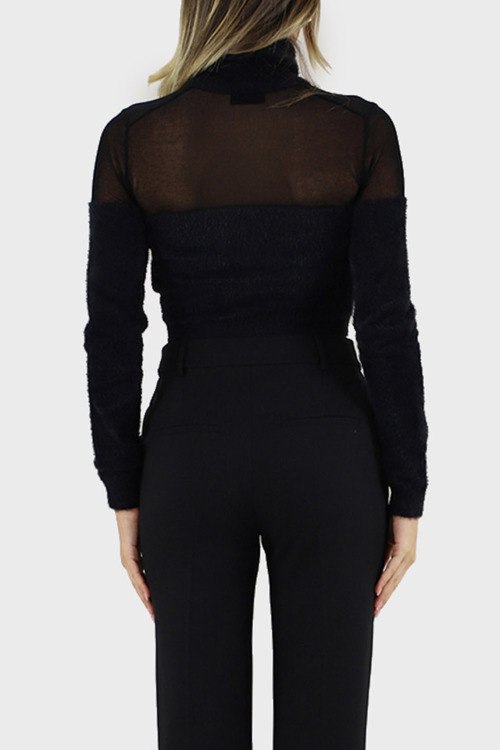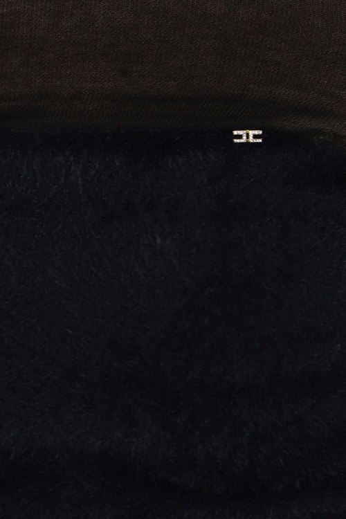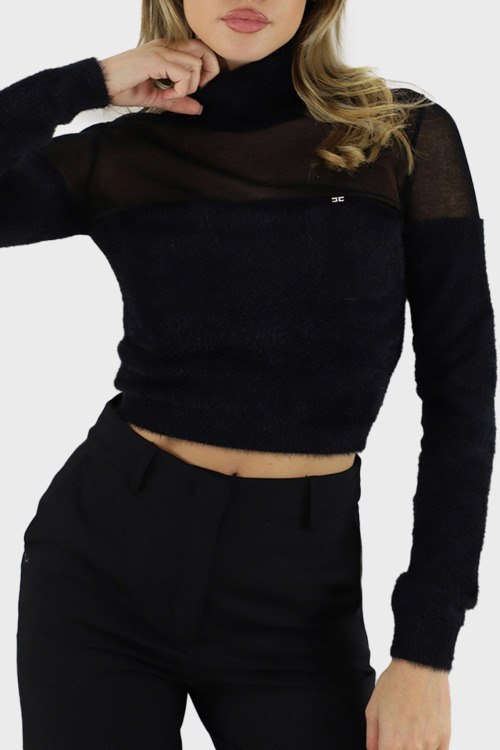 Детали: Женский черный гольф из полиэстера и хлопка от Elisabetta Franchi (Елизабетта Франчи). Укороченная длина, высокий воротник-стойка, длинные рукава, патч-лого
